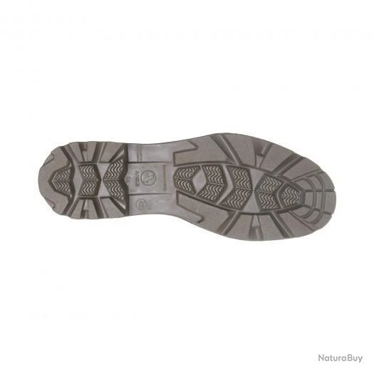 Avec sa semelle en caoutchouc à double crantage unique pour adhérer à tous les terrains : des crampons biseautés pour accrocher sur terrains meubles comme la terre ou la boue et des stries antiglisse pour adhérer aux surfaces lisses ou mouillées comme le béton et le carrelage.