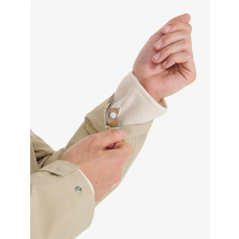 Le bas des manches est ajustable par une patte boutonnées avec pressions, pour une isolation renforcée contre le vent. La fermeture éclair principale bidirectionnelle est dissimulée sous un rabat à pressions invisibles.