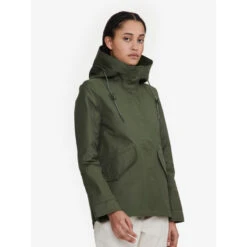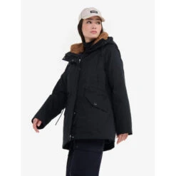 Côté design, la parka affiche une élégance sobre avec des détails soignés. La capuche intégrée dispose d’une visière et est ajustable par cordon, offrant ainsi une protection optimale contre les intempéries.